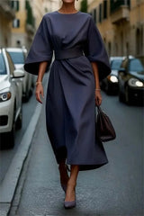 This women’s dress features a midi-length cut with a defined A-line silhouette. It includes a belted waist for shape and bell sleeves for added volume. Designed for use in spring and fall, it is suitable for formal, semi-formal, office, and evening occasions.
