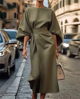• 1 women’s A-line midi dress with belt and bell sleeves