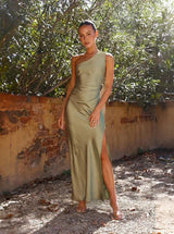 This women’s dress features an uneven hem and angled slit for a distinct profile. Designed for visual balance and comfort across different settings.