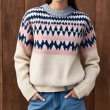 The classic Fair Isle pattern looks fresh with its modern geometric twist and cool color combo. It's light enough to wear indoors but still keeps you warm when you need it. The contrast trim around the neck and cuffs really makes the whole design pop.