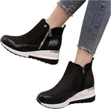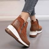 The wedge spreads your weight out so you're not jamming all the pressure onto your toes. The soft fake leather bends when you walk instead of fighting against your feet. You just zip up the side and you're done instead of messing with laces.