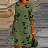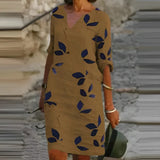This knee-length dress features an A-line cut with a V-neckline and an all-over leaf print, offering a breathable structure for warmer conditions. Its design supports ease of movement, making it suitable for day-to-day summer wear or travel. The printed pattern adds visual detail without overwhelming the clean shape of the dress. With a lightweight construction, the piece supports airflow while maintaining basic coverage. Its neckline and relaxed fit contribute to a structure that does not restrict motion, allowing it to adapt to different body shapes across available sizes.