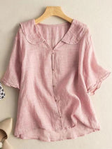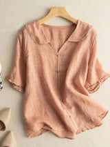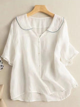 This women’s shirt features short sleeves, a doll collar, and a relaxed structure. Designed for year-round use, it includes a regular length and slight stretch, making it suitable for both casual and semi-formal settings.