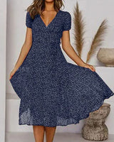 A carefully arranged floral pattern adds visual depth, while the V-shaped neckline complements the natural frame. The dress’s balanced structure enhances the silhouette and presents a refined yet understated aesthetic. Its versatile pattern and shape make it adaptable across different occasions, from informal gatherings to semi-formal events, while retaining consistent comfort.