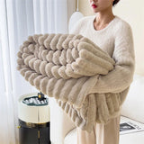 This fluffy blanket is designed to provide warmth and practical use in a variety of settings. Its soft texture and insulating structure make it suitable for colder days or cooler evenings. The neutral appearance allows it to be placed in different environments such as bedrooms, living rooms, or outdoor seating areas.