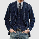 The blazer and vest can be worn together or separately, pairing well with trousers, jeans, or shirts for multiple looks.
