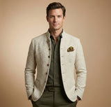 STAND COLLAR DESIGN: Modern collar style adds clean lines and a sharp edge that stands out from standard lapels.