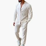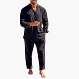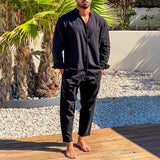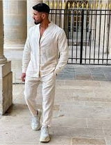 This men’s two-piece summer set combines effortless comfort with timeless style. The set includes a long-sleeve stand-up collar shirt and matching trousers made from breathable, lightweight fabric. It ensures comfort throughout warm days while maintaining a polished and relaxed appearance suitable for casual or semi-formal occasions.