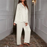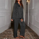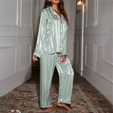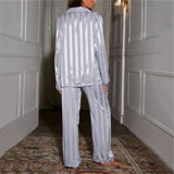 This two-piece pajama set is designed for consistent comfort during rest and leisure. The top features a button-down front for adjustable coverage and ease of wear, while the trousers are fitted with an elastic waistband to ensure a flexible and secure fit. The lightweight construction allows for year-round use in indoor environments.