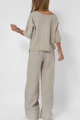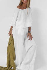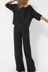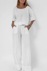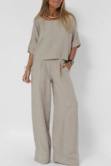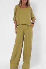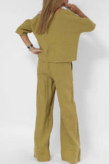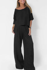 This two-piece set brings together simplicity and style for an effortlessly refined look. The relaxed cropped top and wide high-waisted trousers make it versatile for both casual outings and more polished occasions.