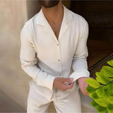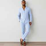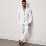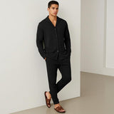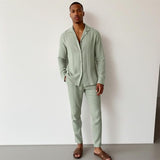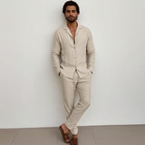 The top features a straight outline with comfortable shoulder width and standard sleeve length. The trousers include an adjustable waist to support a stable fit throughout the day. Both pieces are shaped to allow natural movement without appearing oversized. This provides a composed, easygoing appearance while maintaining practicality.