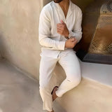 This men’s two-piece set is designed for warm-weather use, offering a relaxed structure suitable for everyday activities. The top and trousers maintain a balanced fit that supports airflow and comfortable movement. The overall design remains simple and functional for use in various casual settings. This set is intended for routine daily wear throughout the warmer months.