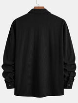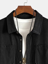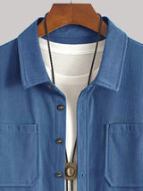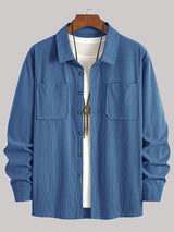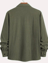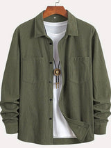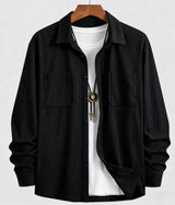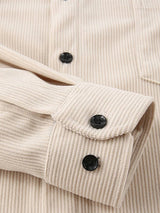 It's made from polyester corduroy that feels soft and doesn't scratch your skin. The relaxed fit gives you room to move without feeling baggy or tight. Two chest pockets hold your phone or wallet and add a nice detail to the look.