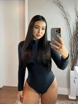 This long-sleeve bodysuit is designed for structured layering and everyday wear. The turtleneck neckline provides extended coverage while the fitted silhouette ensures a secure shape without adjustment. The full-length sleeves and streamlined form make it suitable as a base layer during colder conditions or as a standalone piece in transitional weather. Designed to stay in place, this bodysuit eliminates the need for repeated tucking and supports a clean look under jackets, blazers, or knits.