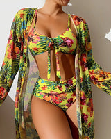 Start the summer with confidence in this stunning three-piece women's bikini set. Featuring a vibrant floral pattern, this set blends style and comfort seamlessly. Whether you’re lounging by the pool or diving into ocean waves, this bikini set ensures you stand out with effortless style.