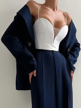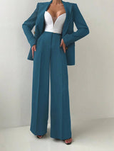 The lapel collar looks clean and classic, and the long sleeves work from spring through winter. Two front pockets hold your phone and keys while you're out. The slim fit blazer and wide leg pants create a balanced silhouette that feels modern and easy.