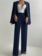 WIDE LEG TROUSERS: High waist and flowing silhouette balance the fitted blazer for a modern, flattering shape.
