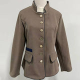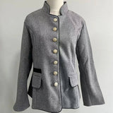 Slip it on over a tee or a crisp shirt, then button up the front with the metal buttons. The stand collar frames your face, and the navy piping sharpens the edges. It layers smoothly without bunching, keeping lines clean from shoulder to hem.