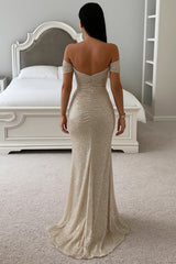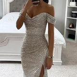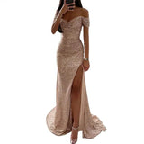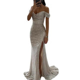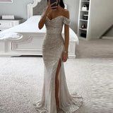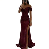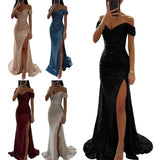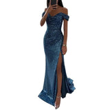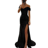 This maxi dress features an off-shoulder neckline combined with a slim, fitted silhouette. The side slit adds movement and balance, giving the design a structured yet fluid appearance.