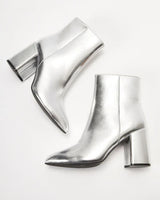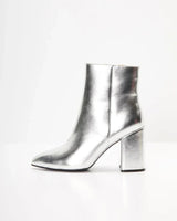 These ankle boots are designed with a block heel and pointed toe, combining style with stability. The metallic finish adds definition, making them suitable for both casual and semi-formal outfits.