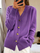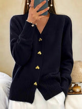 This cardigan blends feminine style with cozy warmth, making it the perfect addition to your wardrobe for the colder season. Featuring charming heart-shaped buttons, this cardigan adds a playful accent to its simple design. Whether at the office, on a walk, or relaxing at home, this cardigan offers versatile style and comfort for any occasion.