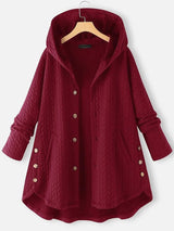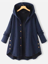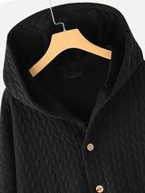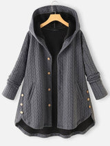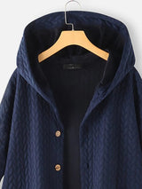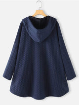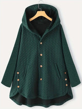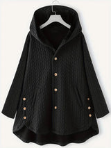 The coat features a hood intended to offer additional coverage in windy or rainy conditions. Its clean design supports pairing with a variety of seasonal outfits. The shape provides a balanced combination of coverage and mobility for walking, commuting, or general outdoor routines. The neutral style makes it suitable for casual, work-related, or travel settings.