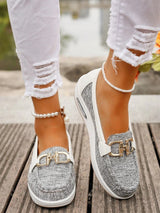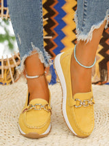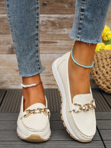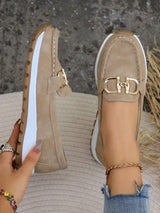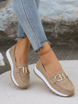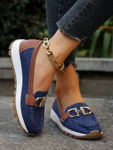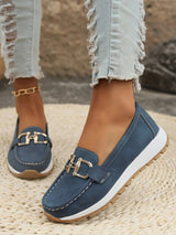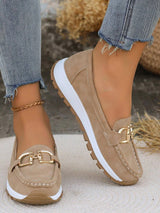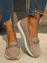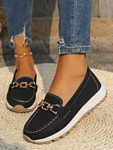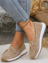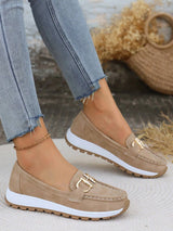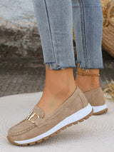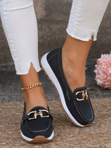 Designed for everyday versatility, these women’s slip-on loafers feature a structured shape, flat wedge sole, and subtle buckle accent. The soft surface finish and breathable interior ensure comfort throughout the day, making them suitable for work, errands, or casual outings.