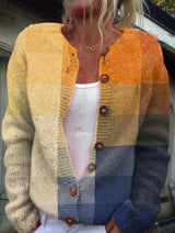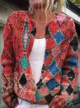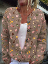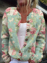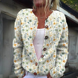 This button-front cardigan is designed with a structured knit and a floral print layout that spans the front section. The opening features functional buttons for easy wear and removal, allowing the garment to be used either fully closed or partially layered. The design supports general use across different outfit combinations including jeans, skirts, or layered base garments. Available in an extended size range, the form allows for coverage across the upper body while maintaining a straight cut through the torso. The surface print presents a repeated floral layout and the fabric allows for machine wash care without distortion of shape.