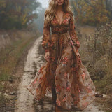 This full-length dress features a flowing tiered design with long sleeves and a printed pattern. Suitable for seasonal wear in casual or outdoor settings, it offers a relaxed fit across the length and sleeves.