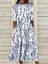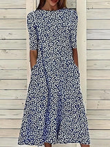 This floral print A-line midi dress is designed for effortless comfort and everyday wear. Its relaxed silhouette offers a breezy fit, making it ideal for warm weather. The lightweight construction ensures comfort throughout the day, while the floral design adds a stylish touch to your wardrobe. Perfect for spring and summer, this versatile dress is suitable for casual outings, daytime gatherings, and weekend wear. The high neckline, short sleeves, and functional side seam pockets combine practicality with a simple, refined look.