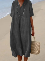 The midi length combined with short sleeves creates an adaptable design that offers both coverage and breathability. This makes the dress suitable for different summer activities, providing enough length for modesty while remaining practical for hot weather. It also balances casual wear with a slightly refined appearance for added versatility.