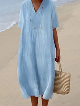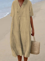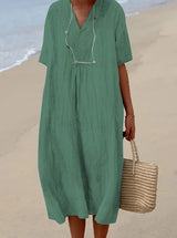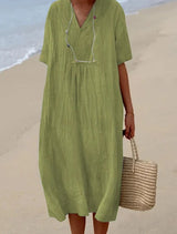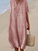 The Jasmine Summer Dress is designed to provide a balanced combination of comfort and style for warm weather. Its structure includes a V-neckline, short sleeves, and a midi length that together create a practical and versatile outfit choice. This dress is suitable for daily wear, casual outings, or relaxed evenings, while the loose fit allows freedom of movement and makes it comfortable to wear for extended periods. Its simple yet functional design ensures it can be used across different occasions without complication.