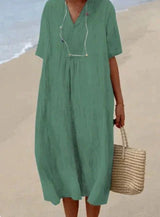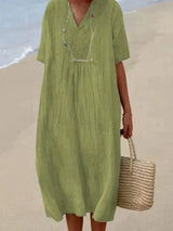 This short-sleeve dress features a V-neck and loose structure for daily wear in warm weather. Its lightweight build supports airflow and ease of movement.