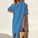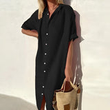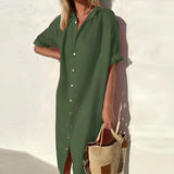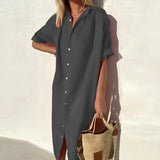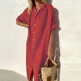 This dress features a shirt-inspired outline designed for warm conditions. The structure maintains a straight and balanced appearance intended for everyday movement. Its overall form supports a simple and practical style suited for routine wear. The arrangement of elements focuses on ease rather than decorative detail.