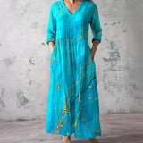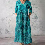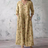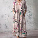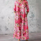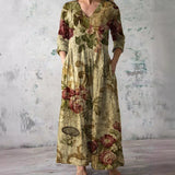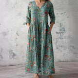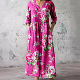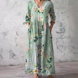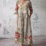 The dress features a V-neck that provides a classic and versatile appearance. The floral pattern adds a seasonal visual element suitable for summer wear. This combination allows the dress to be styled with various accessories. The overall design remains balanced and understated.