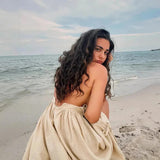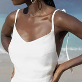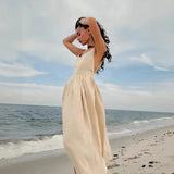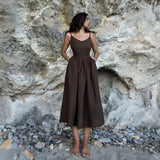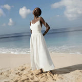The dress features a feminine neckline with slim shoulder straps that provide a light and secure fit. The upper section is designed to sit comfortably while maintaining a clean appearance. The flowing cut creates a balanced shape without restricting movement. This structure supports ease of wear during extended use.