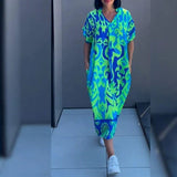 With its printed design, the maxi dress can be paired with sandals, flats, or boots. Its adaptable style makes it suitable for casual daytime use or more formal outings.