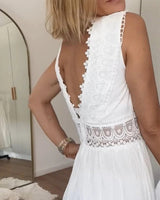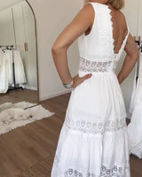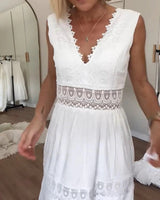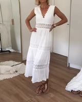 The dress features a sleeveless cut and a V-neck that create a balanced and refined appearance. Decorative inserts add visual detail while maintaining a clean overall look. The flared skirt supports natural movement during walking. The design is suitable for both casual and relaxed settings.