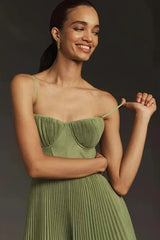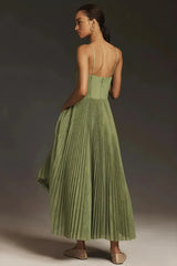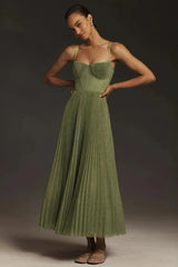 The dress features a fitted bodice that provides a defined and structured shape. The pleated skirt adds movement while maintaining a refined appearance. This combination creates a classic fit-and-flare silhouette. The overall design supports both comfort and elegance.