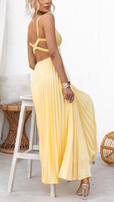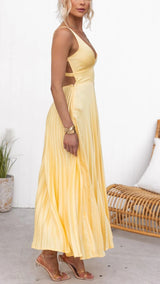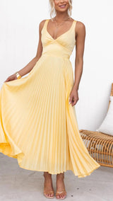 The dress features a deep V-neck and wide shoulder straps that provide a secure and structured fit. The fitted waist helps define the silhouette while allowing comfortable wear. The pleated skirt adds visual movement without affecting comfort. This design supports a composed and elegant look.