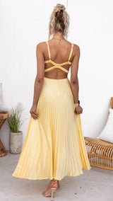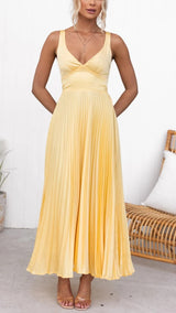 The calf-length cut provides coverage while remaining suitable for summer wear. The pleated structure allows the skirt to move naturally during walking. The sleeveless design supports breathability in warmer conditions. The dress is intended for extended wear during events and daily occasions.