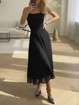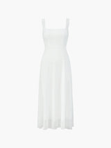 The dress features a square neckline that provides a clean and modern appearance. The fitted upper section supports a defined shape without restricting comfort. This design creates a balanced contrast with the flowing skirt. The overall cut supports a timeless and feminine look.