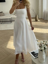 The A-line skirt allows the dress to fall naturally while supporting freedom of movement. The midi length provides coverage while remaining suitable for summer wear. The design is intended for extended wear during events or social occasions. It supports a composed and elegant appearance throughout the day.
