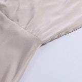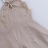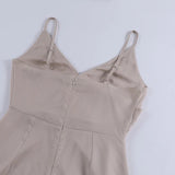 The dress features a V-neckline combined with slim shoulder straps for a clean and structured look. The fitted upper section supports a defined shape without restricting comfort. A subtle back closure allows ease of wear while maintaining a smooth finish. The design supports a streamlined and modern appearance.