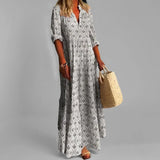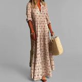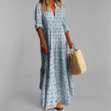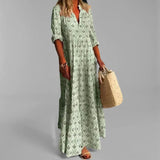 The dress features a vintage-inspired pattern that gives it character without overwhelming the outfit. The V-neckline adds structure, providing a flattering top-line shape, and the 3/4 sleeves offer balanced coverage that works well in changing temperatures. The loose fit supports comfort without losing its elegant outline.