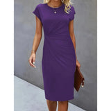 This short-sleeve midi dress is designed for professional and formal settings. It features a tailored fit and clean silhouette, suitable for office environments, meetings, and evening events.