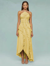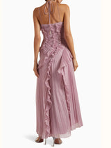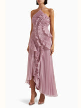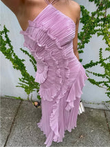 Designed with layered pleats, the dress introduces texture and visual depth without appearing overly structured. The movement of the pleats enhances the overall flow, creating a graceful drape for any occasion.