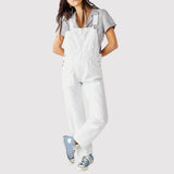 These women’s dungarees are designed with a full-length straight leg and relaxed fit for regular daily wear. The structure includes adjustable shoulder straps, a front chest panel with a center pocket, and button closures on the sides. The design supports layering over T-shirts or long sleeves depending on seasonal needs. Multiple pockets are placed along the front, back, and chest for added function without adding bulk. Intended for use in spring, summer, or autumn, the design provides full leg coverage while allowing airflow and unrestricted movement.