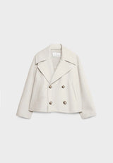 This short jacket features a modern double-breasted design and a structured silhouette, making it a versatile choice for both casual and formal settings. Its cropped cut and clean outline allow it to pair effortlessly with trousers, skirts, or dresses, supporting a variety of looks throughout the season.