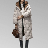 This long winter jacket provides balanced insulation for cold-weather use while maintaining a smooth, structured appearance. Its extended length supports full coverage, and the added hood offers adjustable protection in varying temperatures. The clean outline ensures a neat fit that works well with different outfits.